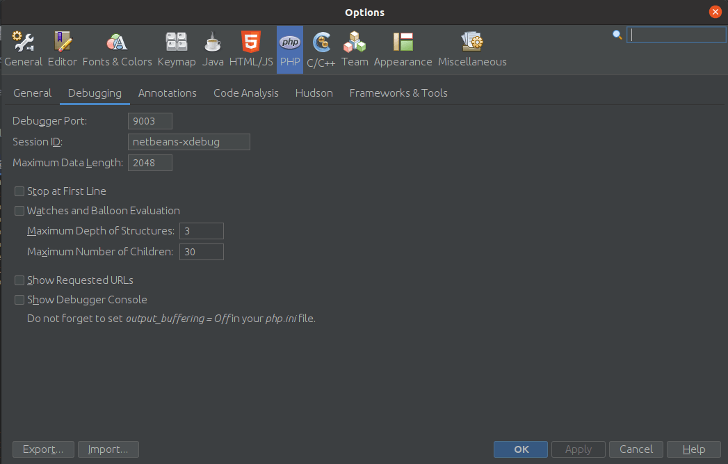 xdebug.default_enable=1 xdebug.force_display_errors=1 xdebug.remote_enable=1 xdebug.remote_handler=dbgp xdebug.remote_autostart=1 xdebug.remote_connect_back=0 xdebug.mode=debug xdebug.idekey=netbeans-xdebug xdebug.remote_host=127.0.0.1